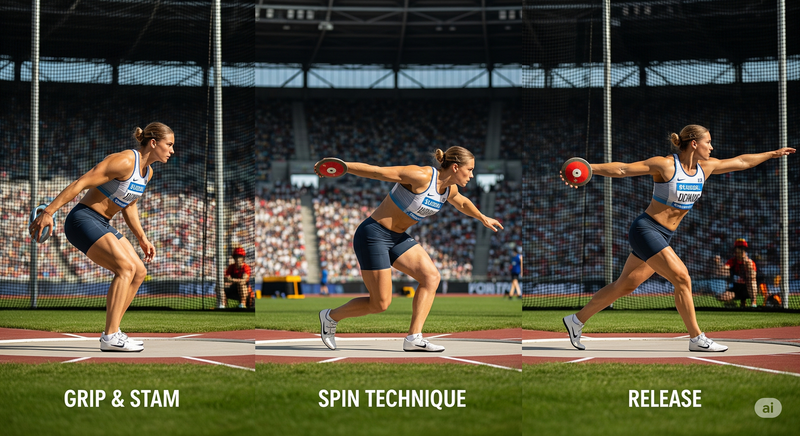 Grip & Stance: Hold discus flat with fingers, stand sideways.